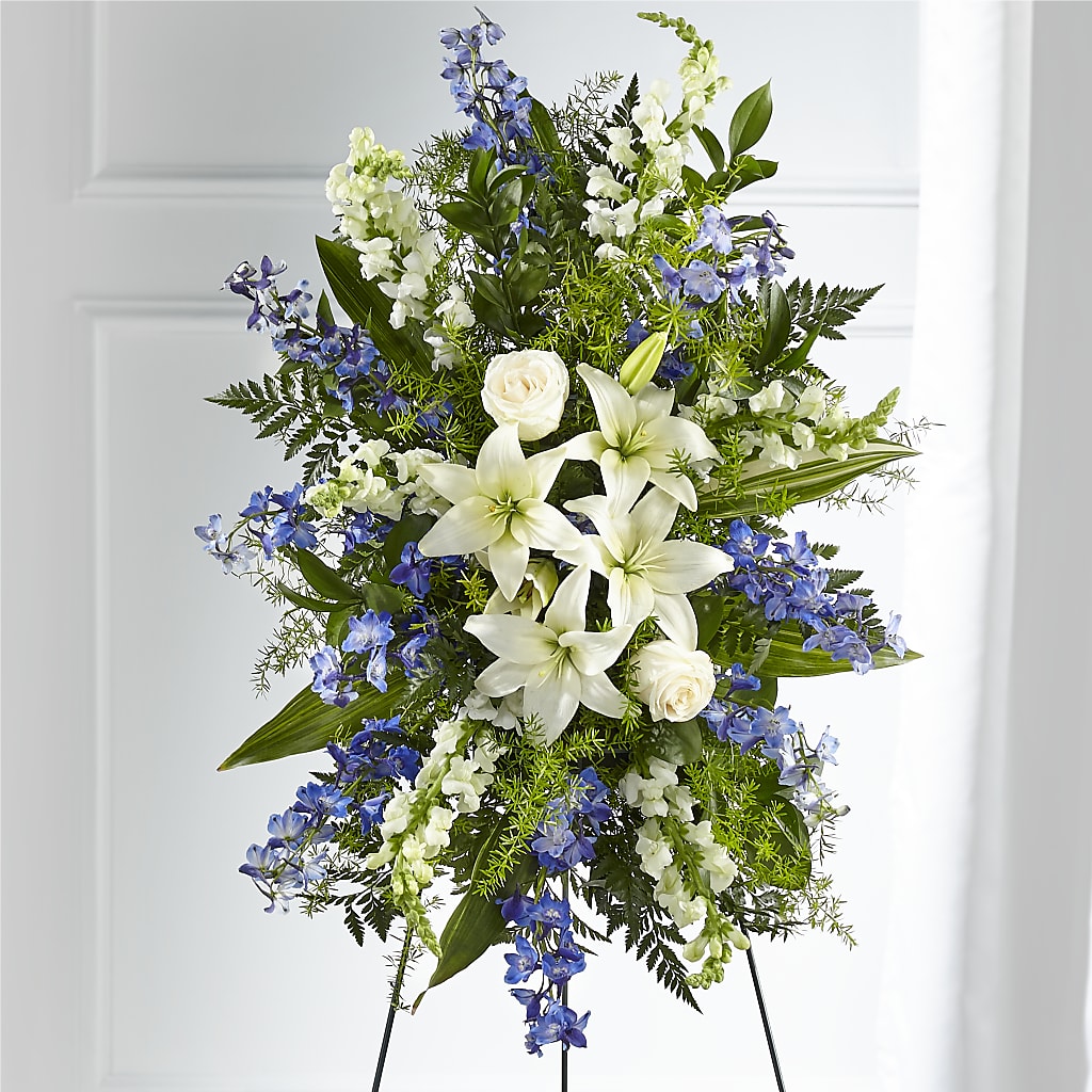 A collection of bold blue flowers shares a tribute that words cannot express. Designed with lilies, roses, delphinium and snapdragons our Faithful Friend Standing Spray is a grand gesture to express kindness and solace to a loved one.